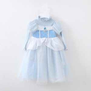 Girls’ Light Blue Sweater Knitted Long Sleeve Mesh Dress Halloween Kids’ Dress